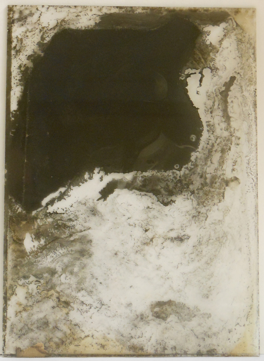 Die lichtempfindliche Schicht hat sich vom Glas gelöst, nur mehr sein Gesicht und die Schulterpartie sind vorhanden. Alles andere ist unwiederbringlich verloren. Der Zerfall frisst sich durch das Porträt.