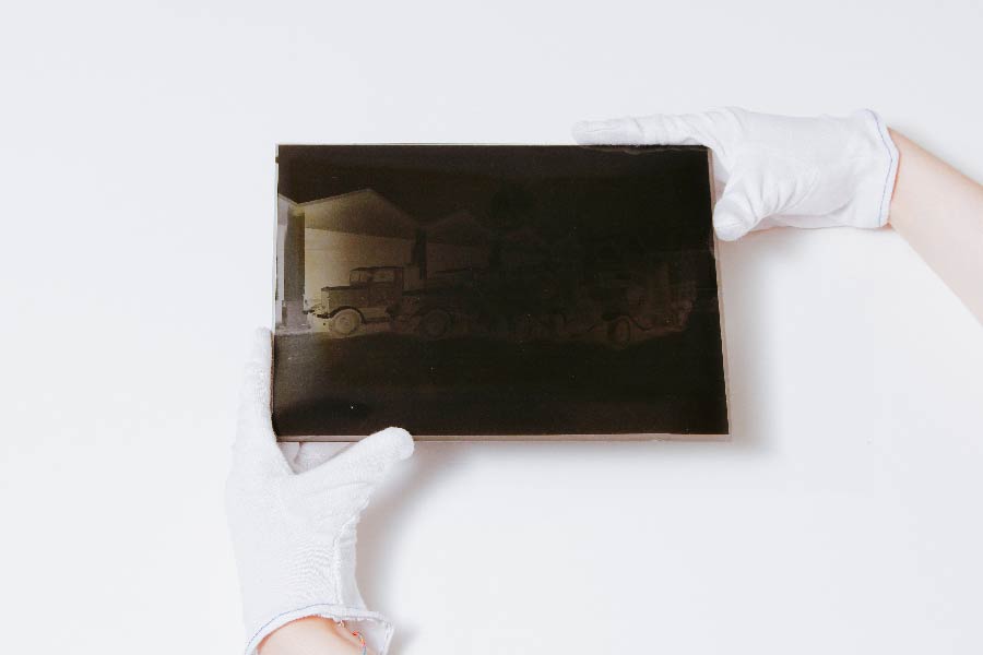 Bevor wir uns näher mit dem Inhalt der Glasplatten befassen, werden diese zunächst vorsichtig gereinigt. Dies machen wir, um das Bild ohne Kratzer und andere Schäden bewahren zu können. Mit weichen Pinseln unterschiedlicher Größe werden beide Seiten vorsichtig von Staub und Schmutz befreit.
