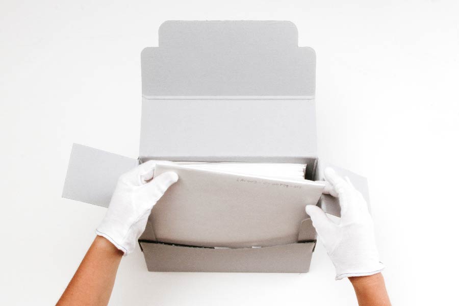 Die Glasplatten in den Papierumschlägen packen wir in säurefreie Kartons. Wir legen sie nicht aufeinander, sondern stellen sie aufrecht nebeneinander in die Boxen.