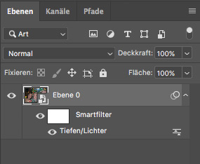 Sie können „Tiefen/Lichter“ als Smartfilter einsetzen, indem Sie ihn auf ein Smartobjekt anwenden: Dafür wandeln Sie jede Ebene per Rechtsklick und den Befehl „In Smartobjekt konvertieren“ in ein solches um. Mit einem Doppelklick auf den Filter öffnen Sie „Tiefen/Lichter“ bei Bedarf erneut, um die Werte anzupassen.