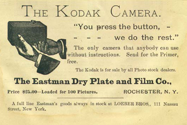 Die Entwicklung der Fotografie beschleunigt sich, je größer ihr Publikum wird. 1888 produziert die Firma Kodak ihre erste Fotokamera (Nr. 1) für Amateurfotografen. Es handelt sich um einen mechanischen Fotoapparat mit Rollfilm und ohne Sucher. Den Apparat auf das Motiv richten und abdrücken, das ist die Devise: „You press the button, we do the rest.“ Zu Deutsch etwa „Sie drücken auf den Knopf, den Rest erledigen wir.“ Der Kunde braucht nur die Mittelformatrollen einzuschicken und erhält die entwickelten Fotos als Papierabzüge. Millionen dieser Fotokameras werden verkauft.