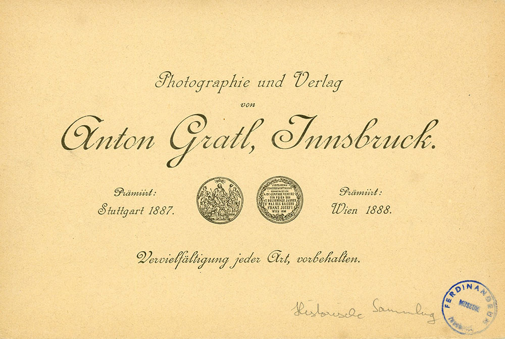 Für die Datierung der Fotografien sind die Rückseiten der Kartons aufschlussreich, weil sie neben dem Namen des Ateliers oft auch datierte Nennungen von Prämierungen enthalten. In diesem Fall wurde das Atelier von Anton Gratl aus Innsbruck in den Jahren 1887 und 1888 ausgezeichnet, weshalb die vorliegende Fotografie danach entstanden sein muss.