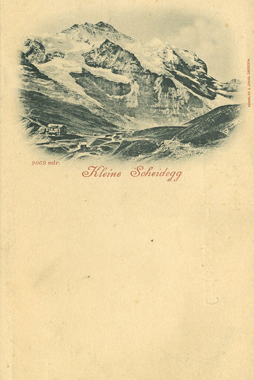 Ansichtskarte „Kleine Scheidegg“ (Schweiz), Lithografie (Rückseite), vor 1894 Römmler & Jonas bzw. Edition Photoglob, Tiroler Landesmuseum Ferdinandeum, Bibliothek, CC BY 4.0