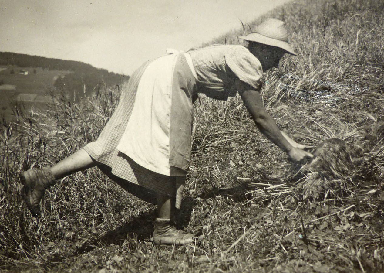 In der Hand hält sie eine Sichel. Sie ist dabei, das eben gemähte Getreide, das am Boden liegt, zu Garben zusammenzufassen und zu binden. Später dann werden diese Garben zum Trocken aufgehängt werden. Und noch später im Jahr, wenn auf den Feldern die Arbeit getan ist, werden diese Bündel in die Scheune gebracht, gedroschen und das gewonnene Korn in Säcke abgefüllt. Der Bauernhof, auf dem meine Tante zusammen mit ihrem Bruder und dessen Familie lebte, liegt weit oben am Berg, auf 1.400 Meter Höhe, ein Südtiroler Bergbauernhof im oberen Pustertal. Als dieses Foto um das Jahr 1948 entstand, war meine Tante etwa 25 Jahre alt.