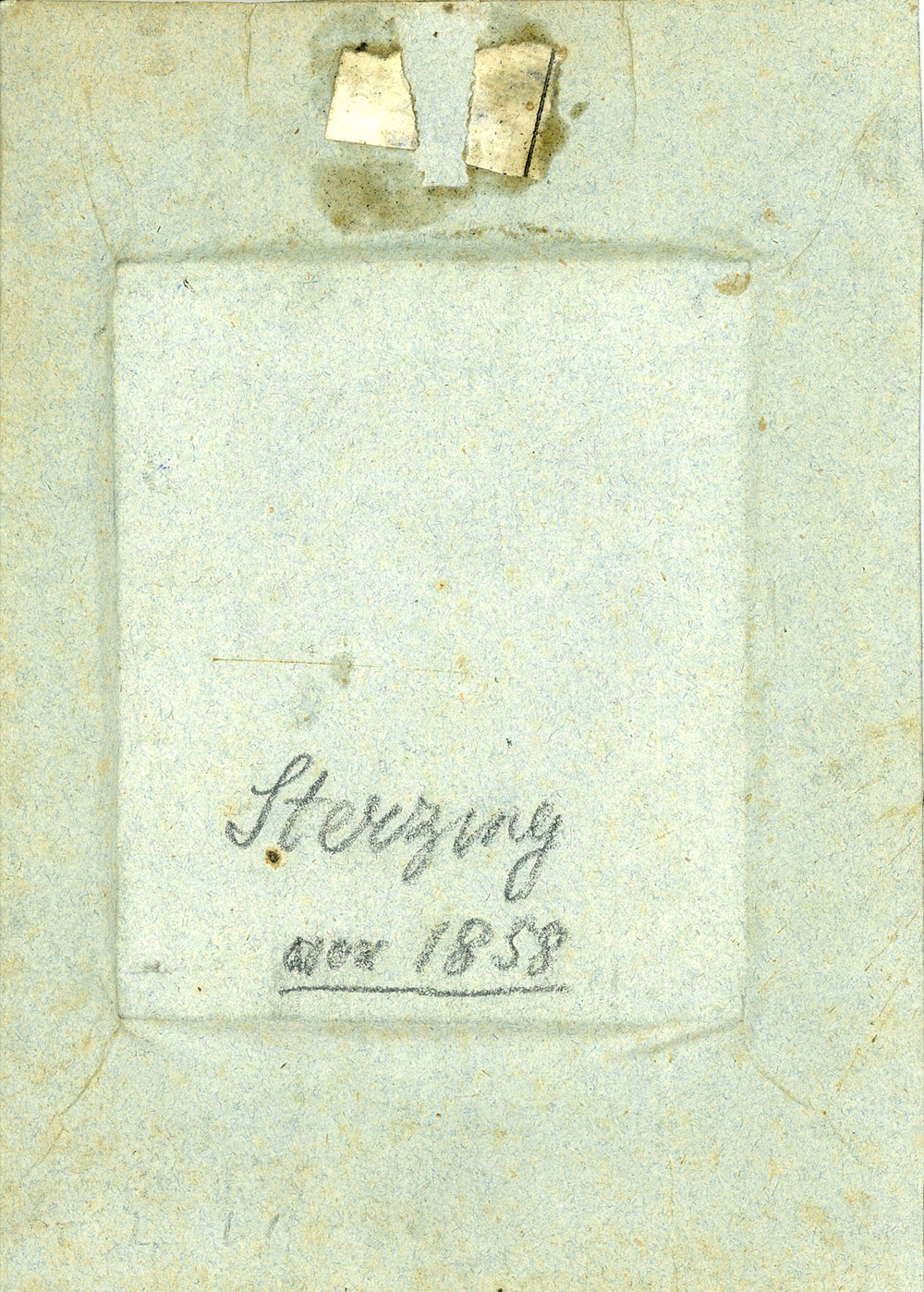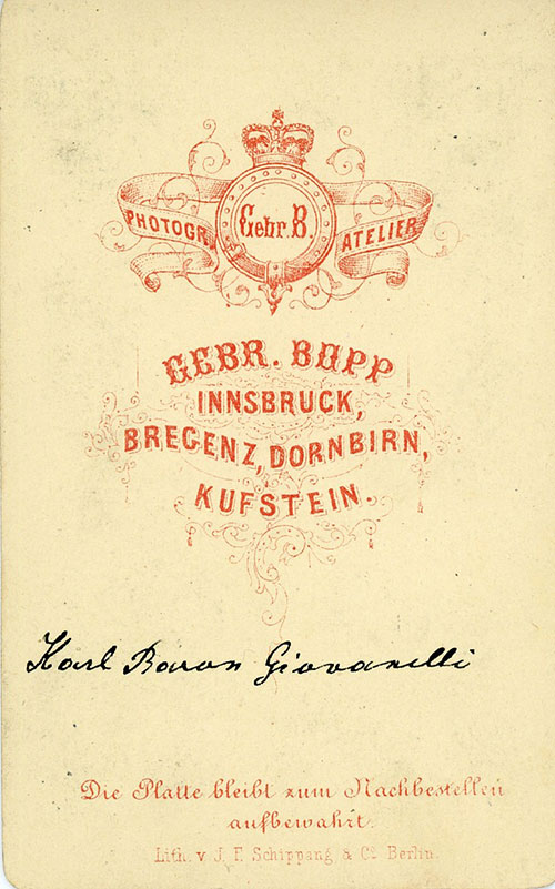 Nella seconda metà del XIX secolo la carta all’albumina diventò il più diffuso tipo di carta fotografica ad annerimento diretto. A causa del suo sottile spessore veniva incollata su un cartoncino rigido prevalentemente in formato gabinetto e visita. Dal retro dei cartoncini è possibile trarre informazioni relative alla datazione della foto, al nome dello studio fotografico e a eventuali premi ottenuti. L’esempio in questione riguarda un’onorificenza assegnata negli anni 1887 e 1888 allo studio fotografico Anton Gratl di Innsbruck, ragion per cui questa foto deve essere stata realizzata solo successivamente.