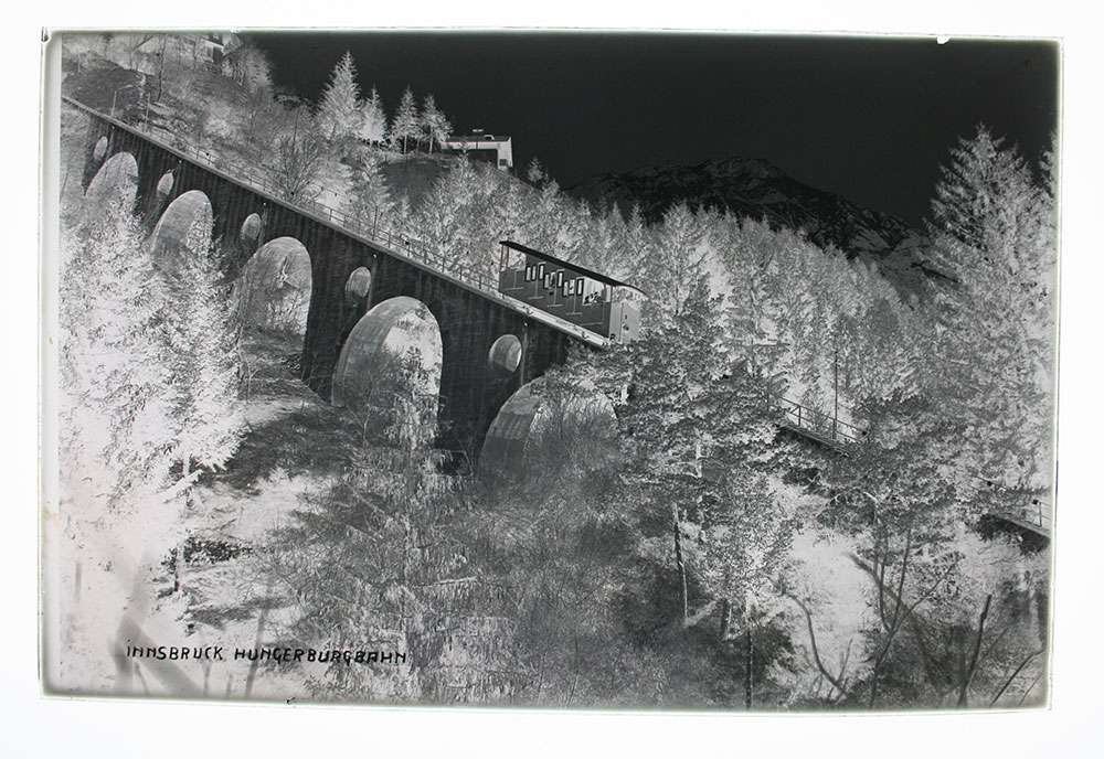 Le lastre di vetro vennero utilizzate come supporto fino alla seconda metà del Novecento. La ripresa fotografica della funicolare della Hungerburgbahn è tratta dall’archivio d’impresa di Adolf Künz, direttore di una casa editrice di cartoline postali nel periodo tra le due guerre.